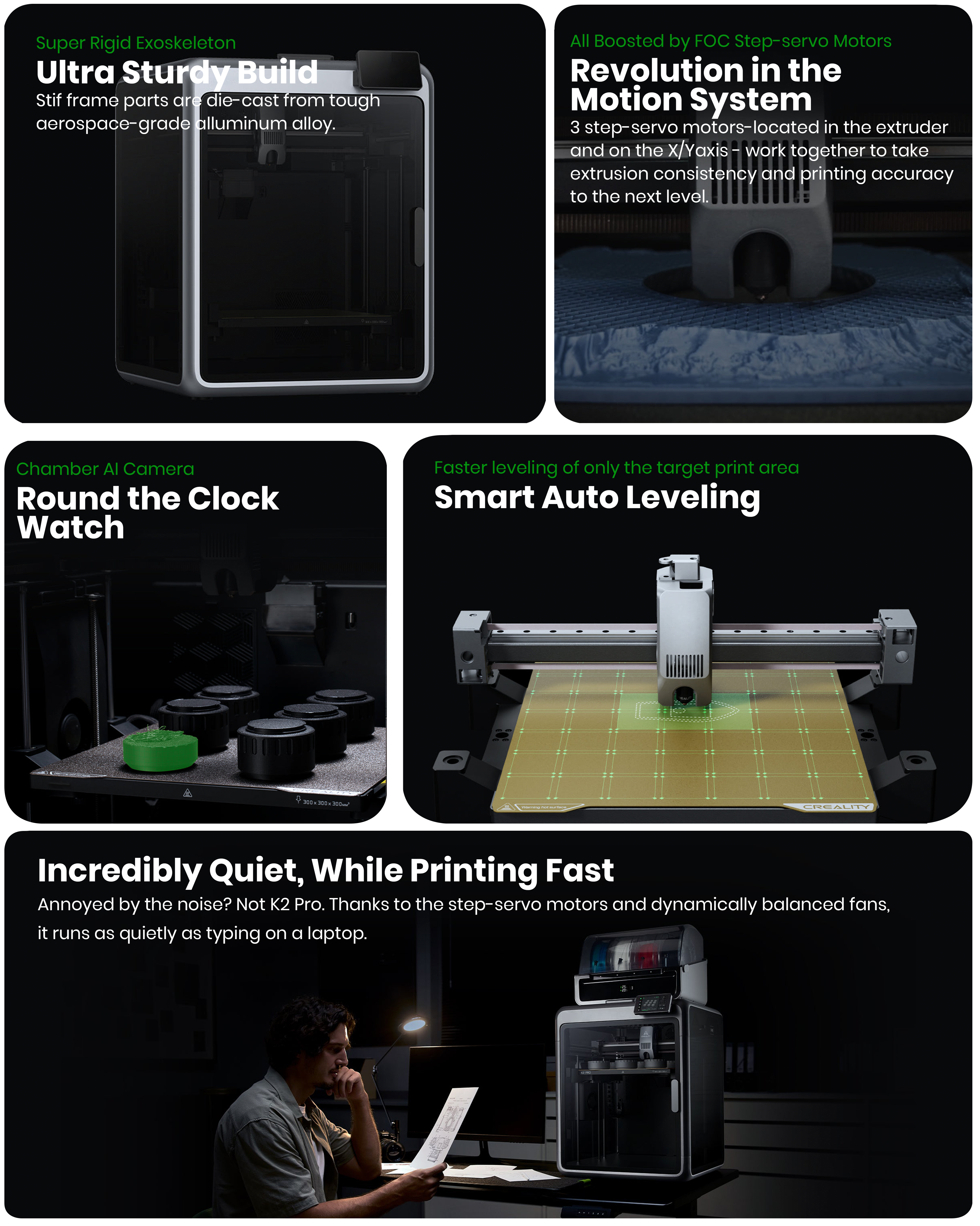 The K2 Pro prints up to 600 mm/s with 20,000 mm/s² acceleration.