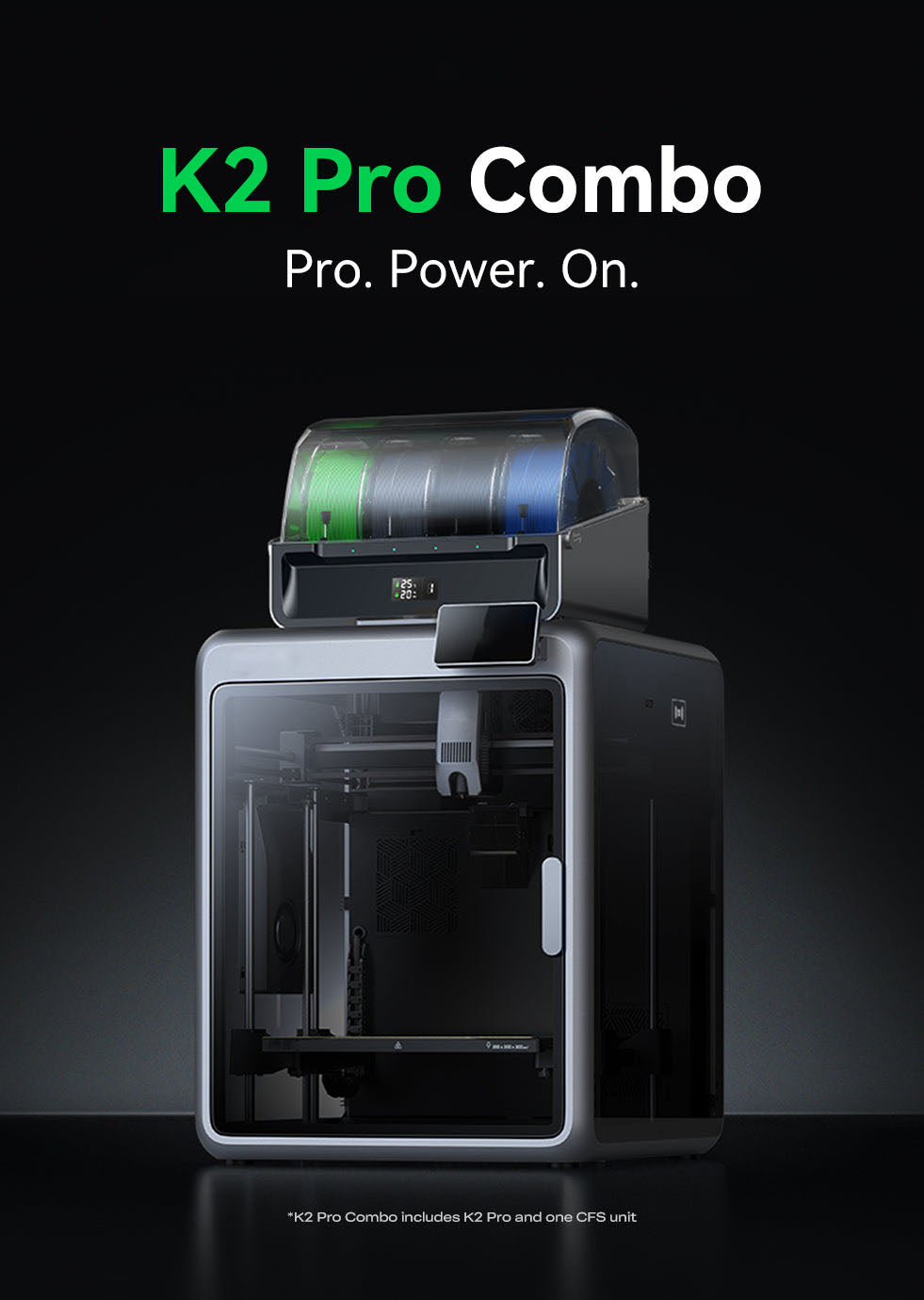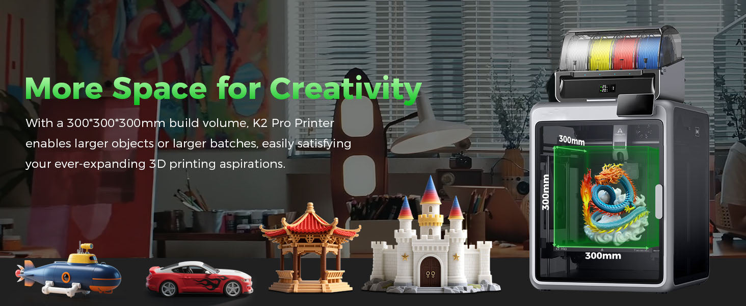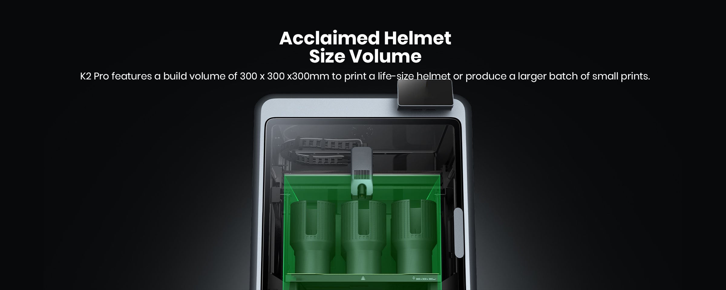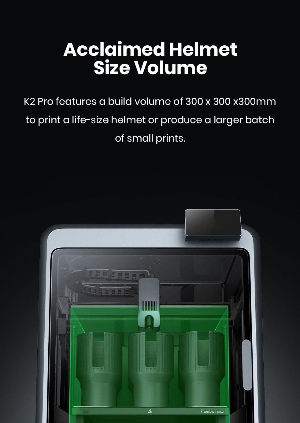 The K2 Pro provides a larger 300 × 300 × 300 mm build volume.