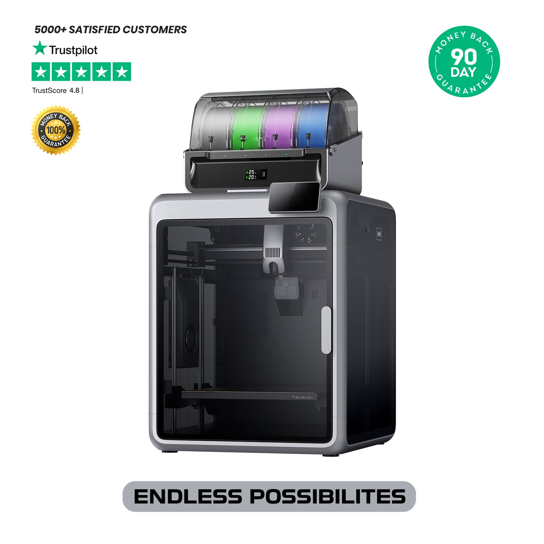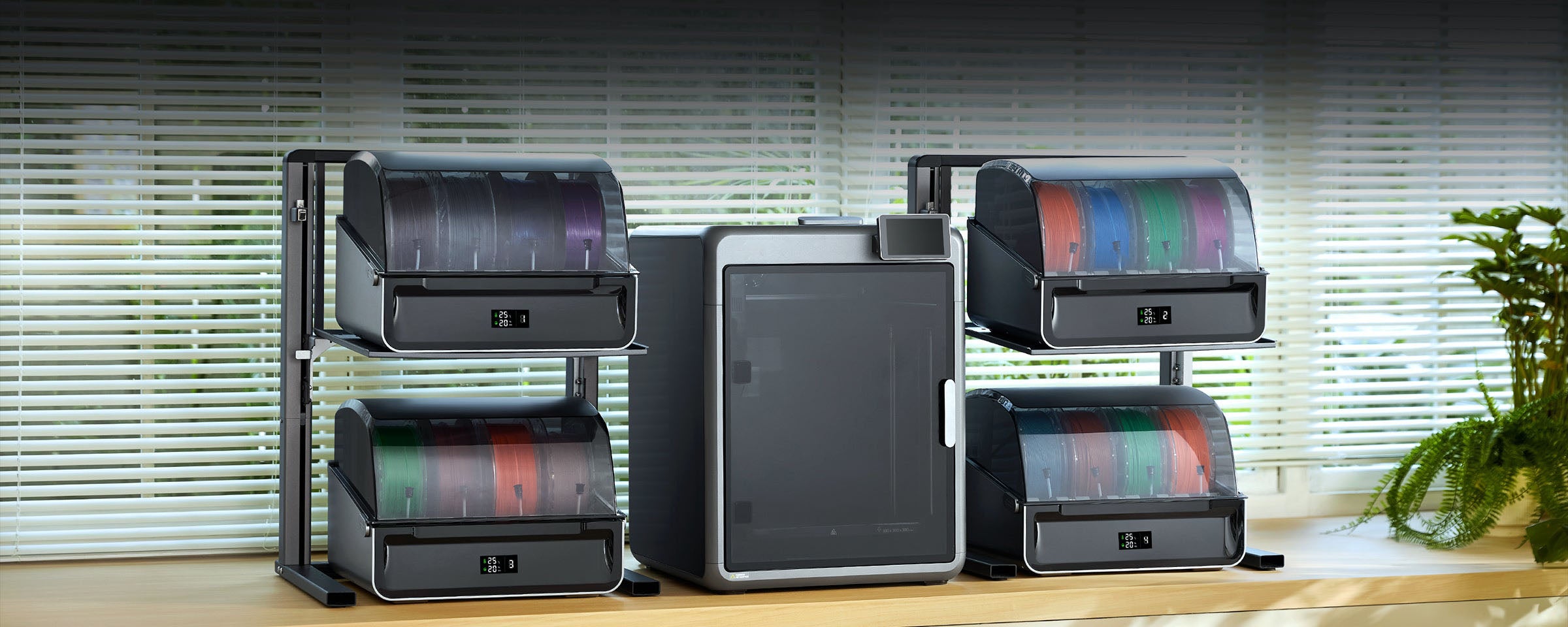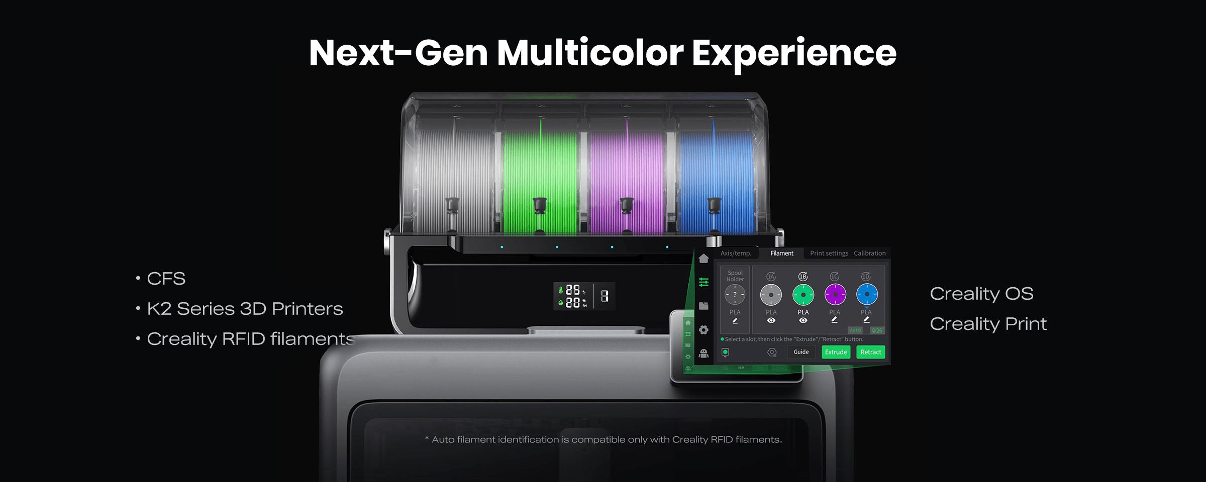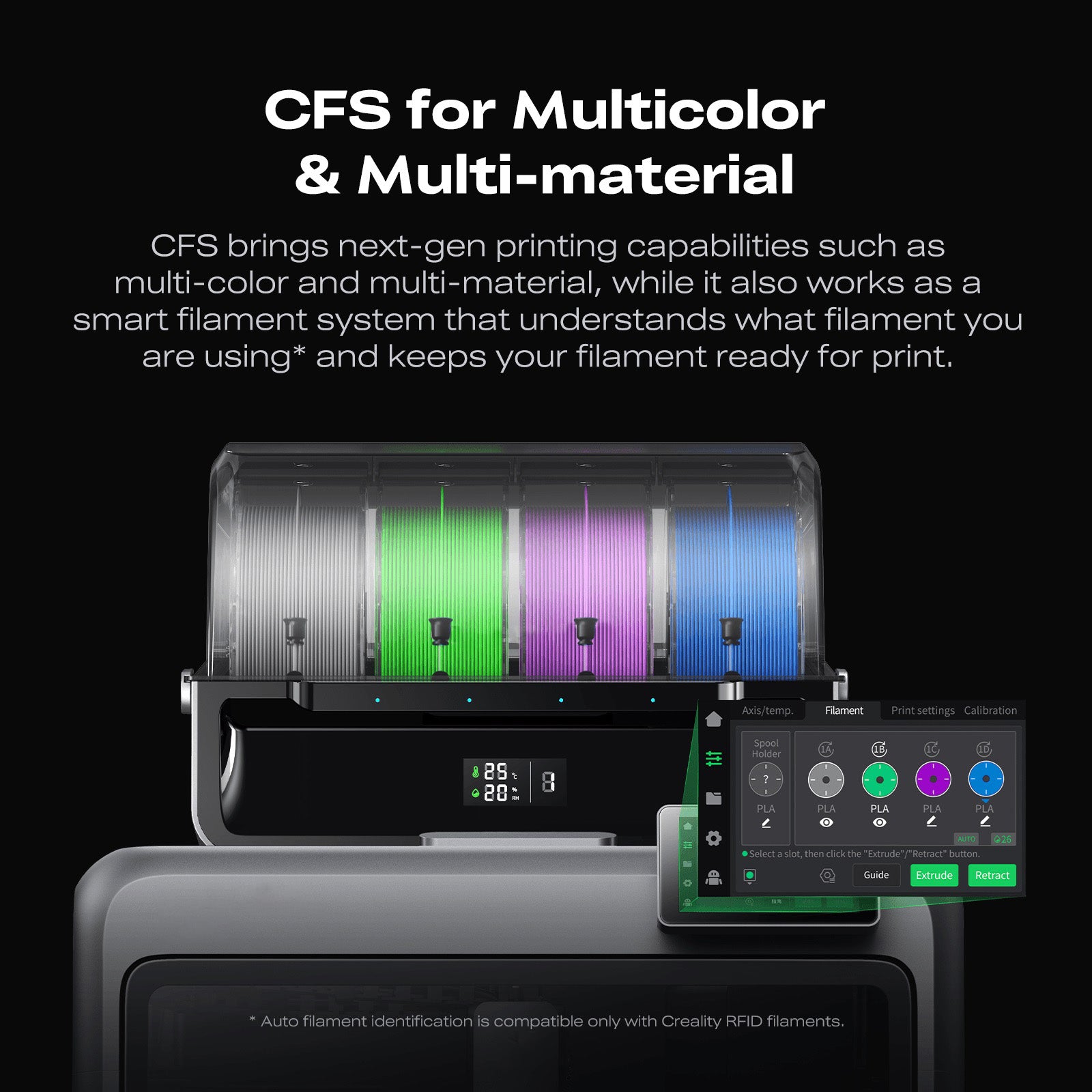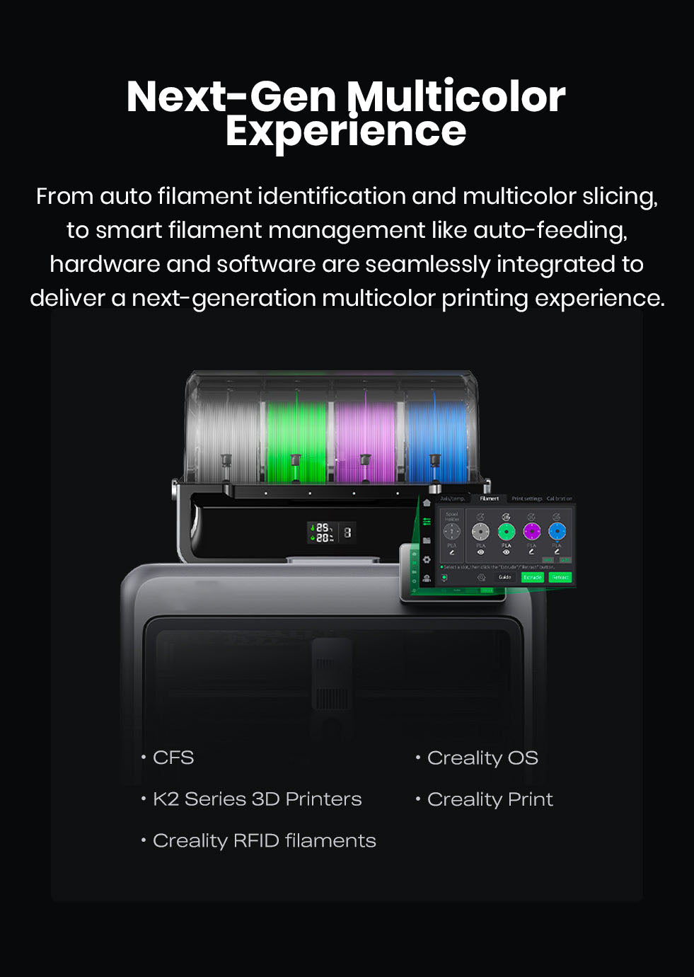 Supported Filaments: PLA/PETG/ABS/ASA/PET/PLA-CF; *Not compatible with flexible TPU, damp BVOH/PVA, or warped cardboard spools.
