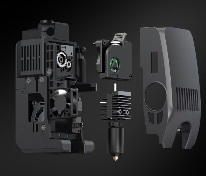 The tri-metal nozzle curbs heat creep effectively for minimal clogs, and the integrated nozzle design. The magnetic front cover make the nozzle swap a breeze.
