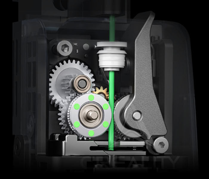 Hardened steel gears for battery durability. No issue coping with the repeated filament ingress and egress.